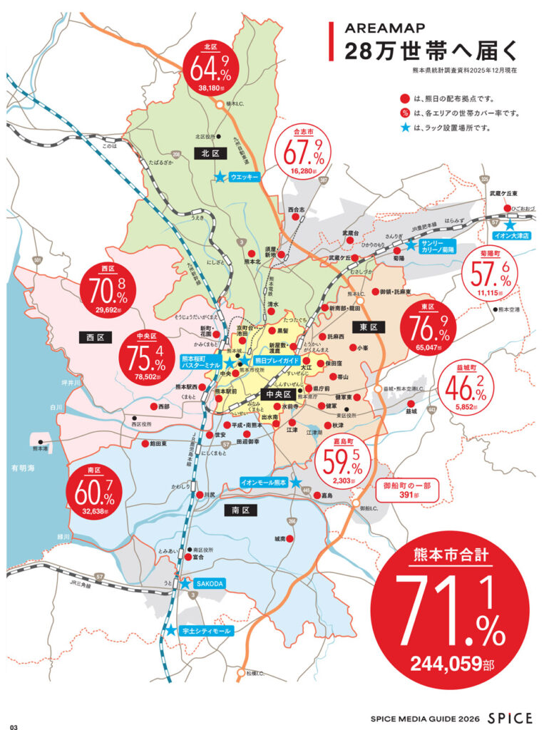 「くまにちすぱいす」は新聞を購読されていない世帯にもお届けし、熊本都市圏28万世帯に届きます。熊本市内の世帯カバー率は約70%と高いリーチ力を誇り、特にすぱいすの読者層である30~50代のファミリー層に直接PRができます。